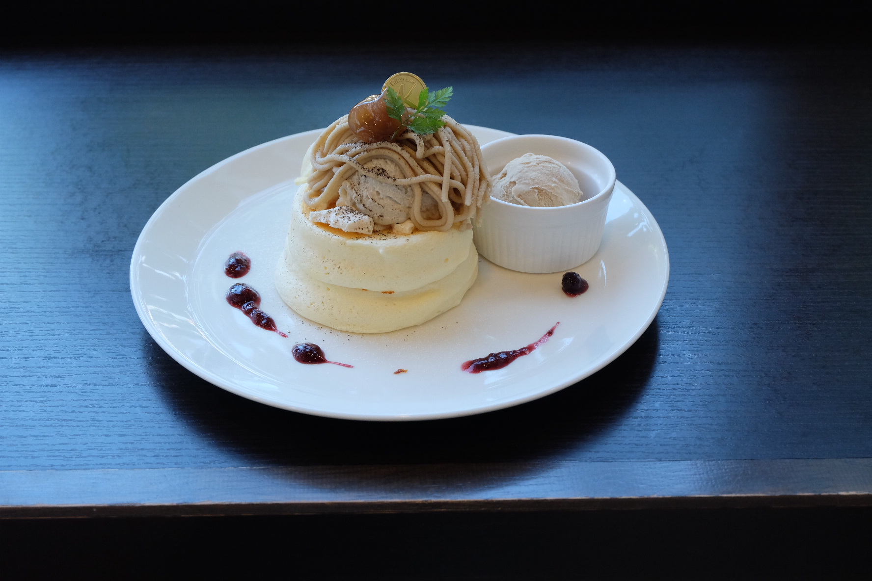 ほのかに香るラム酒入り和栗モンブランです。ほうじ茶とマスカルポーネクリームが入っています。ほうじ茶とは気づかない微妙な香ばしさとマスカルポーネのコクが、高級感を感じていただけると思います。マロングラッセジェラートやベリーソースを添えながらお召し上がりください。