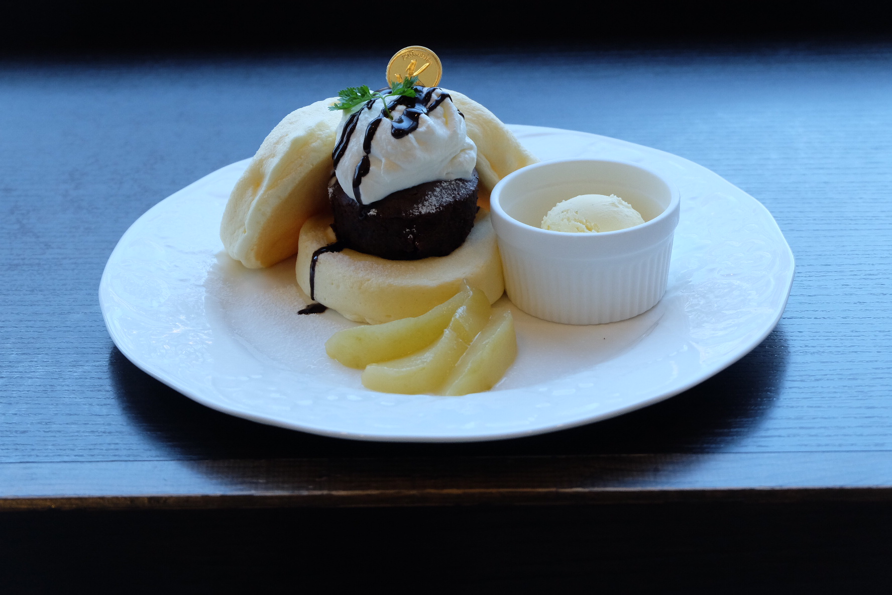 テイクアウト可 米粉のフォンダンショコラはお口の中がとろけるほどのまろやかさです。白ワインで煮込んだ山形県産のラ・フランスのコンポートを添えました。