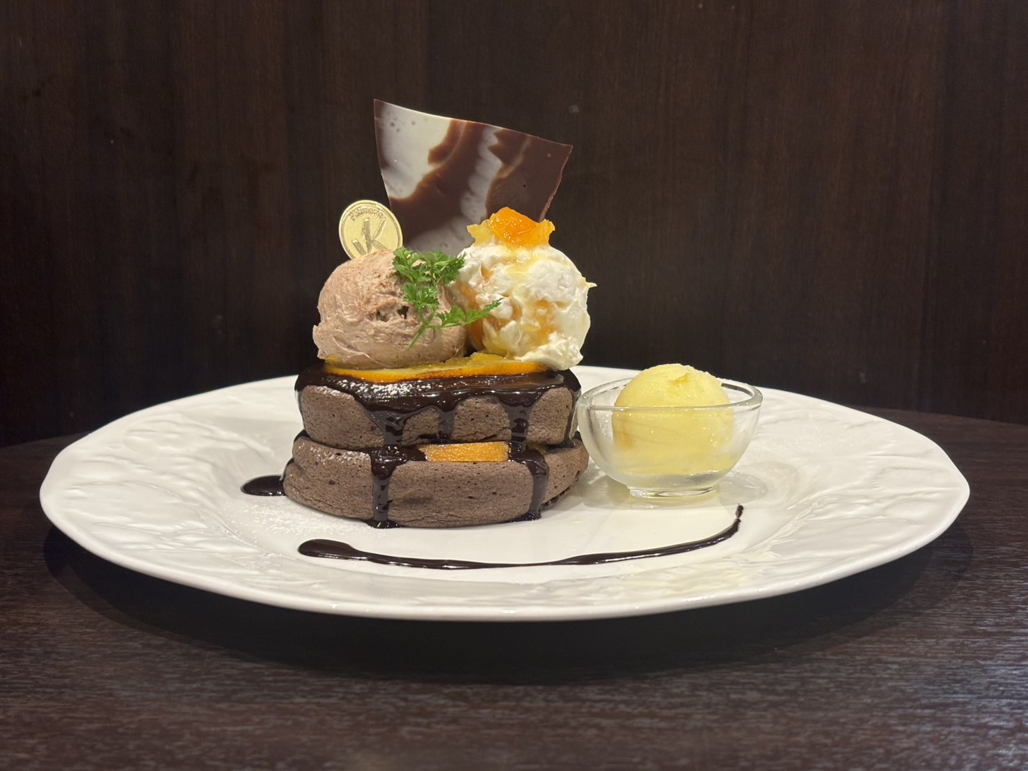 ココア生地のパンケーキにビターチョコソースとオレンジのコンポートを重ねました。チョコクリームとオレンジと金柑のコンフィチュールクリーム、ゆずジェラートが爽やかな余韻を添える、大人のための柑橘ショコラです。