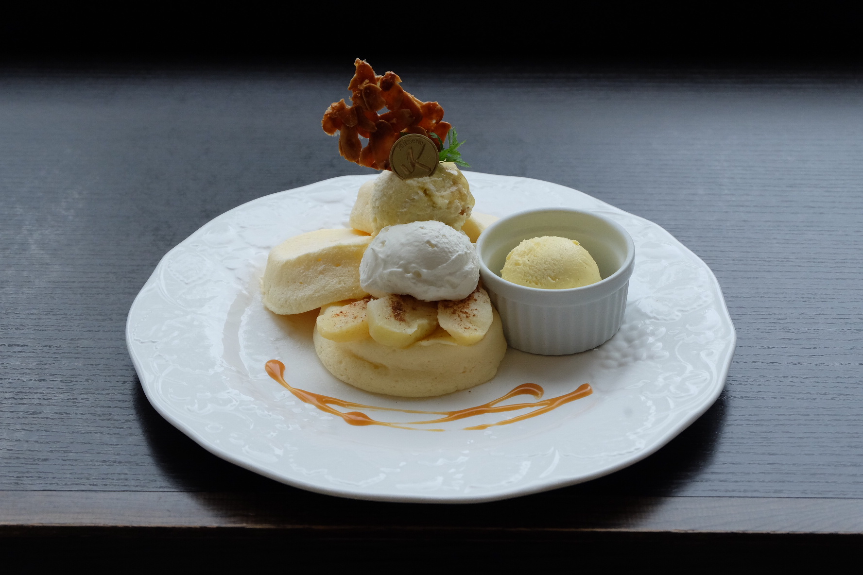 紅はるかをこしたさつまいもクリームと、りんごをバターでソテーしシナモンをかけたパンケーキです。