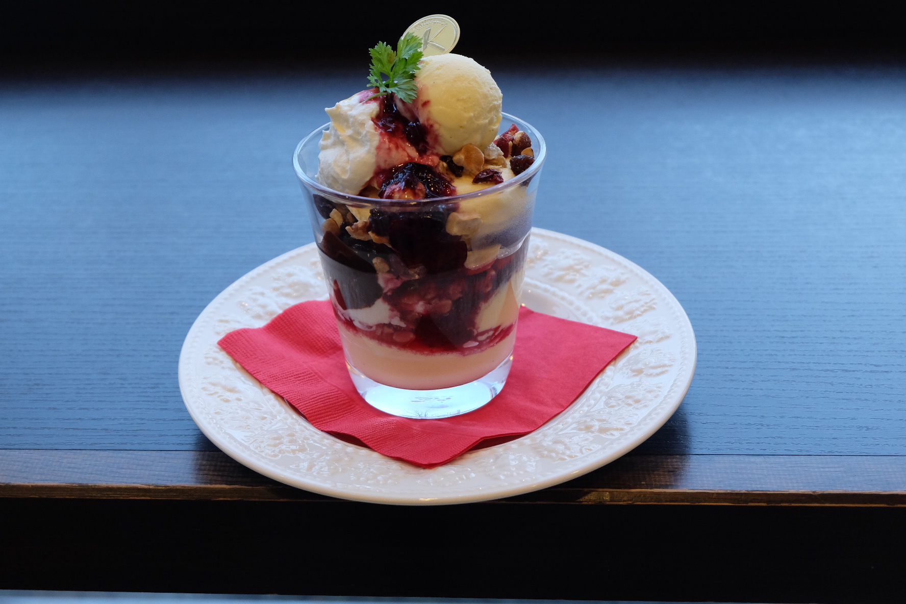 グラスにはパンケーキ、生クリーム、カスタードクリーム、バニラアイス、ミックスベリー、チョコソース、オーガニックオートミールグラノーラが入っています。通常のパンケーキと同じ量です。